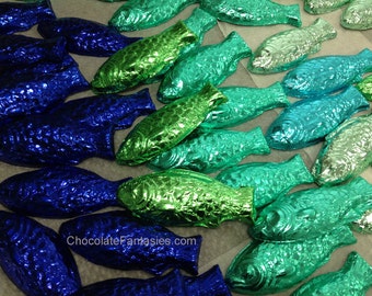 a package of foil-wrapped chocolate fish sits above a longer package with a scarf folded inside.